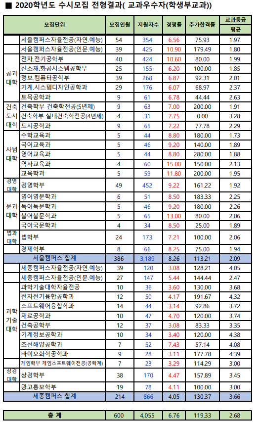2020학년도 수시모집 입시결과 교과우수자