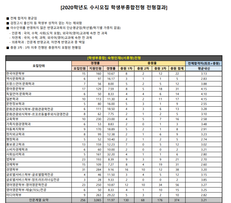 숙명여자대학교 2020학년도 수시등급 학생부종합전형 결과