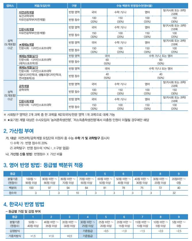 춘천캠퍼스와 삼척캠퍼스의 반영영역 및 점수에 따라 환산 점수가 달라지니 참고하시길바랍니다.