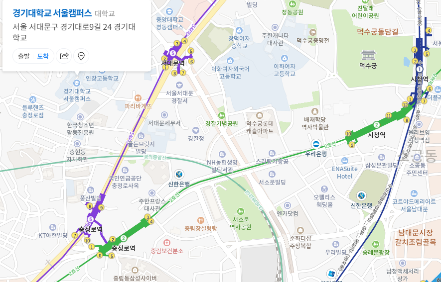 서울캠퍼스는 서대문역(5호선)과 충정로역(경기대입구)[2호선,5호선]을 끼고 있어, 서울권에서 접근성이 아주 좋은 위치에 있습니다.