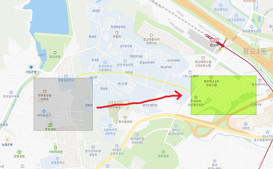 경기대학교 수원캠퍼스는 학교 후문에 광교역(신분당선)이 위치하고 있어, 분당선라인 및 2호선 강남역(30분대)에 접근성이 뛰어납니다.