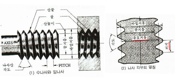 삼각 나사/사각 나사/사다리꼴 나사/톱니 나사/둥근 나사/한줄나사/두줄나사/오른나사/왼나사