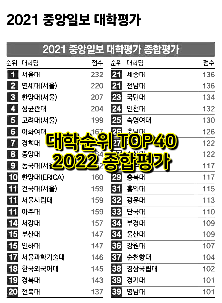 매년 조금씩 바뀌는 대학 순위가 궁금하신 분들이 많이 계실 것입니다. 오늘은 2022 대학순위를 알려드리고자합니다. 기준은 중앙일보 대학평가 점수를 기준으로 대학의 모든 부분을 평가한 종합평가 지수를 기준으로 상위 40개 대학이 나열되어 있습니다.