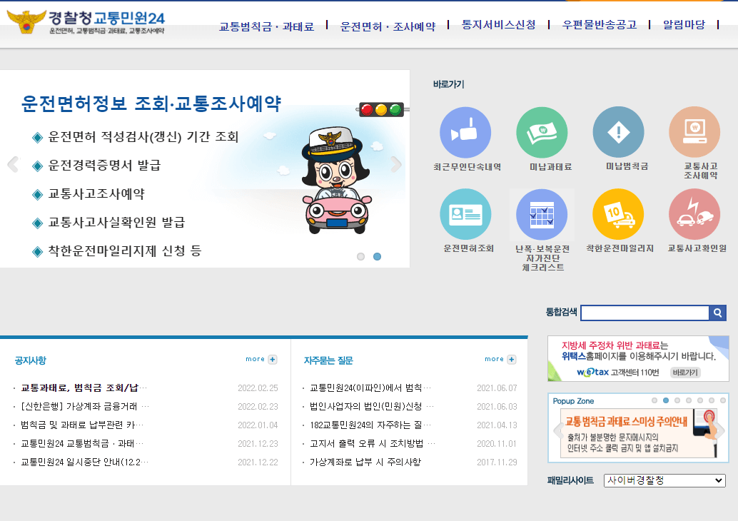 경찰청 교통민원24를 통해 교통범칙금, 과태료 등을 편리하게 조회 및 납부가 가능하며 운전면허 및 무인단속 내역 조회, 적성검사, 경력증명서 등 이외 다양한 서비스를 이용할 수 있습니다.